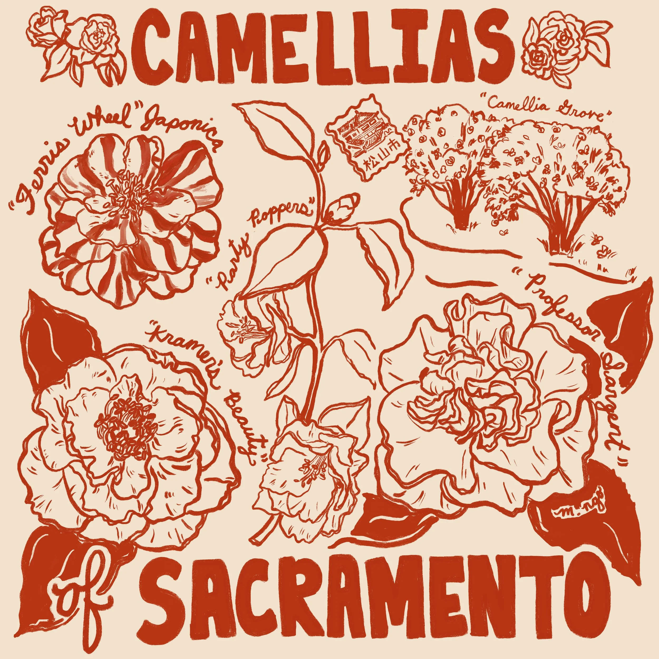 Most recently, I wanted to create a new illustration that celebrates Sacramento and its rich history. I decided to focus on our official city flower, the Camellia, of which there are over 50,000 Camellia trees that exist within the city. I garnered a lot of information through the Camellia Society of Sacramento, a nonprofit organization founded in 1941 that is primarily made of passionate community members of Sacramento. Did you know Sacramento has a sister city in Japan that also shares the same city flower? And that we used to throw an annual parade, a Camellia ball, and crown a Camellia Queen? My illustration, which I turned into a tote bag and accompanying bookmark, highlights four varietals of Camellias, including the Ferris Wheel Japonica, Party Poppers, Kramer’s Beauty, and Professor Sargent varietals. I also included a stamp highlighting the sister city of Matsuyama, Japan, and the Camellia Grove in the California State Capitol Park.