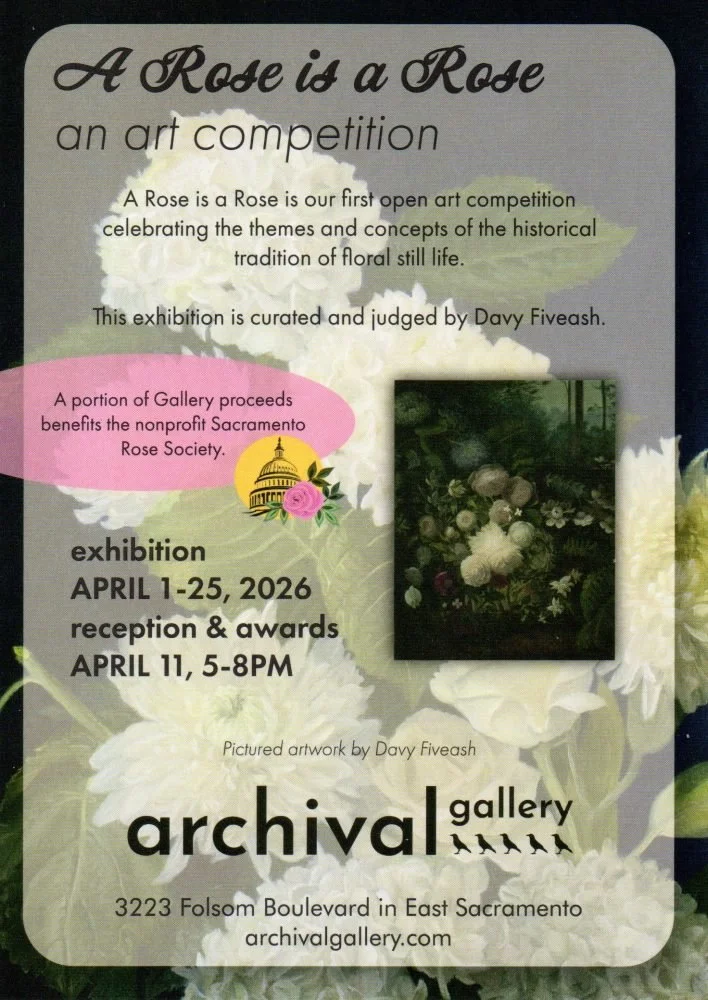 The show will be up from April 1st to the 25th, with a reception on Second Saturday, on April 11th from 5-8pm, with flowers on display from the Rose Society, music and refreshments. A portion of sale proceeds from this collection will also support the nonprofit Sacramento Rose Society. If you’re in the Sacramento area, please come by to take a look at the work on display!